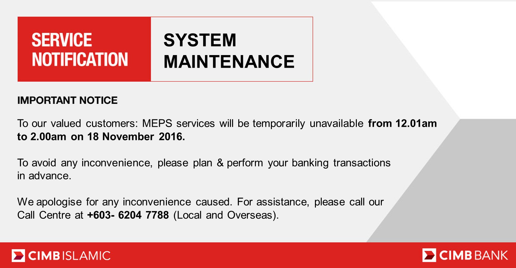 Cimbmalaysia En Twitter Meps Services Will Be Temporarily Unavailable Due To System Maintenance From 12 01am To 2am On 18 November 2016 Https T Co Bt4jpycn17 Twitter